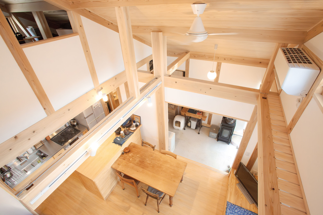 その後、窓断熱や、ロフトの収納力アップなど、より住みやすくするための改修を少しずつ重ねているO邸ですが、内装は床壁天井がすべて杉無垢材に統一され、そのことにより周囲の環境とご家族の要望に応じた建物全体の間取りの工夫が引き立ちます。年数が経過しても新鮮なインパクトを持ち続けるO邸を、ぜひ体験してみてください。