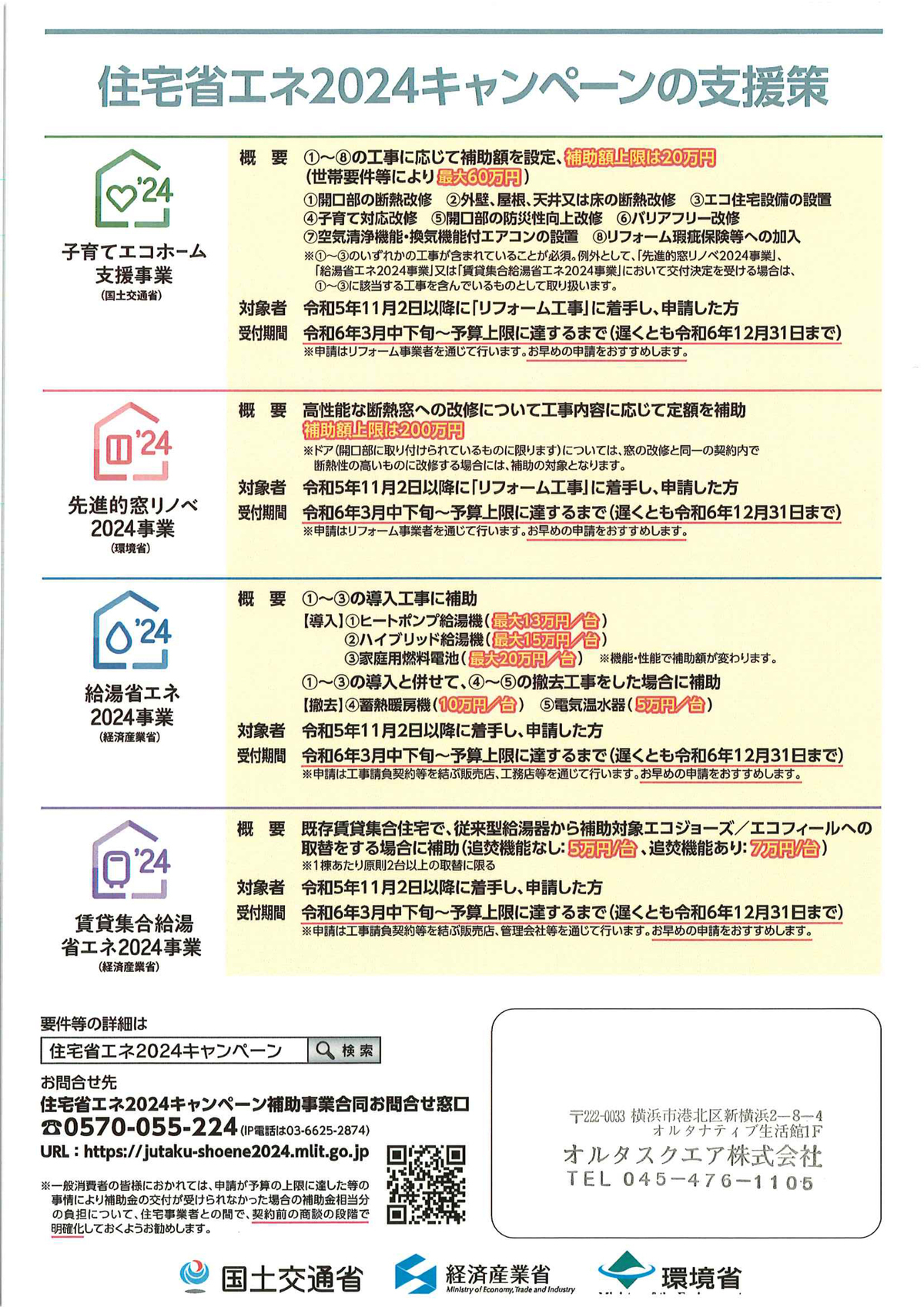 このうち、リフォーム業者が事業者登録できるのは1と2で、当社はすでに事業者登録を済ませています。省エネリフォームをご検討の際は、ぜひこの「住宅省エネキャンペーン」の利用について当社にご相談ください。