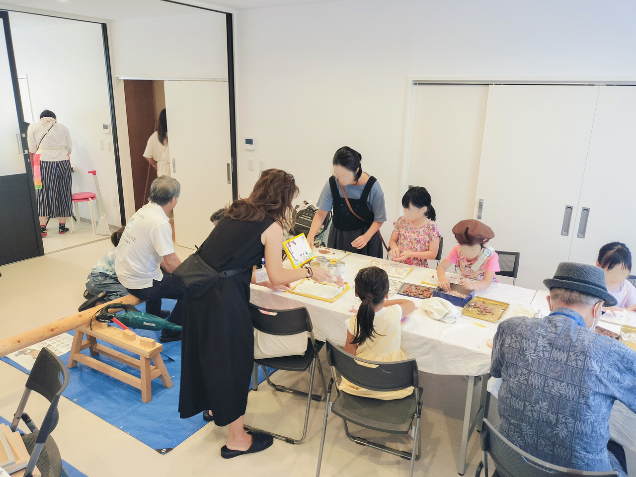 開催当日は、個別相談4名 漆喰アート参加者 25名 丸太切参加者:20名程度と大勢の参加があり特に午前中は多くの親子での参加があり、スタッフが対応に大忙しの状況でした。